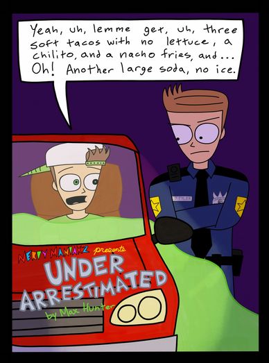 The fifth page kicks off this three-page long comical montage while also briefly setting up the fact that Max is a demon. This is the first of many assault and battery crimes featured in the comic. In fact, the time periods for most of these scenes are accurate to how long ago the referenced comic/drawing are from Under Arrestimated, albeit some of these time frames were changed to months as opposed to years to better fit the lore of Nerdy Maniakz.