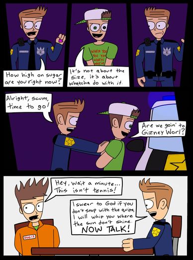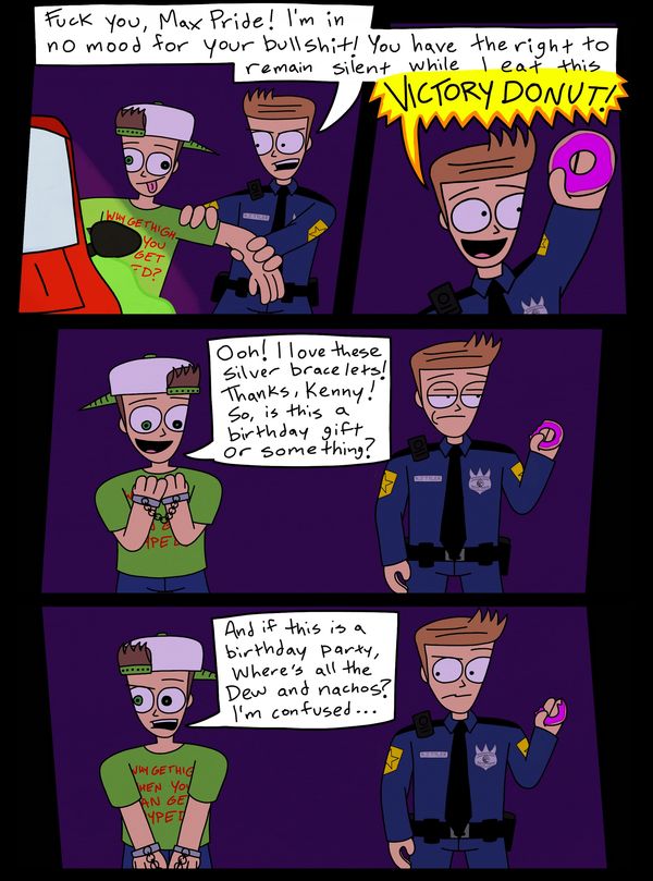 The second page further establishes our characters and their relationship despite how painfully it is. We learn here that Max is addicted to sugar, currently being high (or hyped, as Kenny says on Page 3) on the stuff. He is seemingly in a very loose state, unaware of the fact he's being arrested and instead believes he's at his birthday party. Meanwhile, we learn Kenny has been chasing after Max for a long time, exasperated by his nonsense for the last time but glad that it's all over with, even pulling out a donut he saved for the occasion. This also establishes that the green stuff is definitely Mountain Dew, though again this could be Fyzzi and just happens to call it Mountain Dew because perhaps he sees our reality beyond the panels.