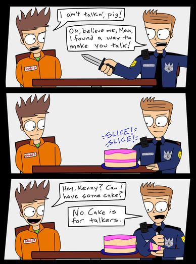 Another redundant thumbnail but you gotta love how Kenny briefly becomes a South Park character in panel 2. Honestly, this one really looks like that meme where something gets more and more simplified, even down to the simple interaction between the characters in panel 3. "Cake?" "No." Oscar winning material right there!